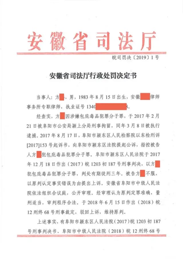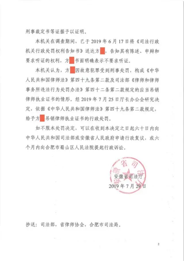 行政处罚:安徽省司法厅于2019年7月29日给予方某吊销律师执业证书的行政处罚。