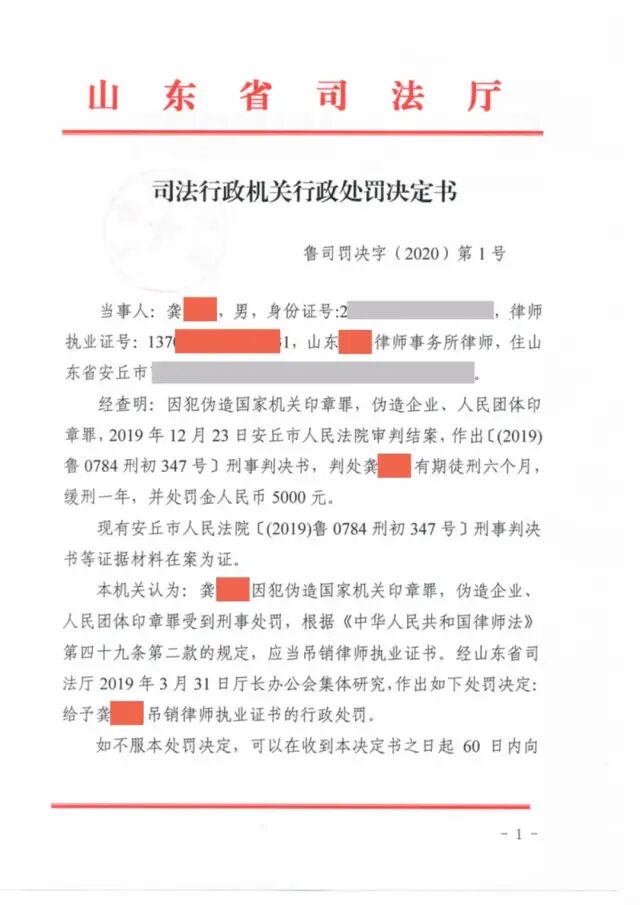 行政处罚:山东省司法厅于2020年4月1日给予龚某吊销律师执业证书的行政处罚。