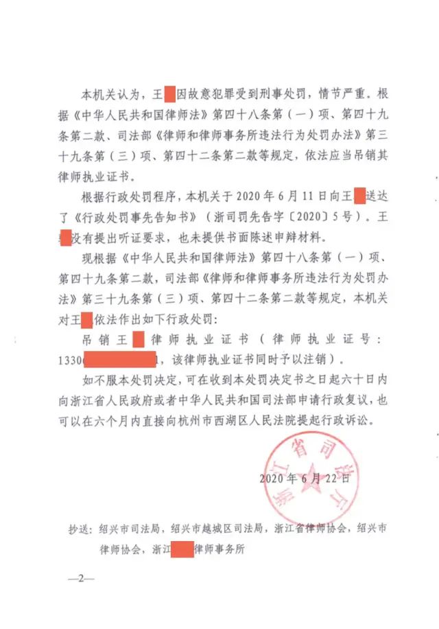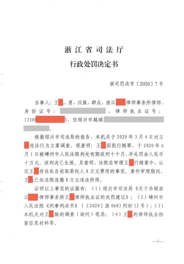 行政处罚:浙江省司法厅于2020年6月22日对王某作出吊销律师执业证书的行政处罚。