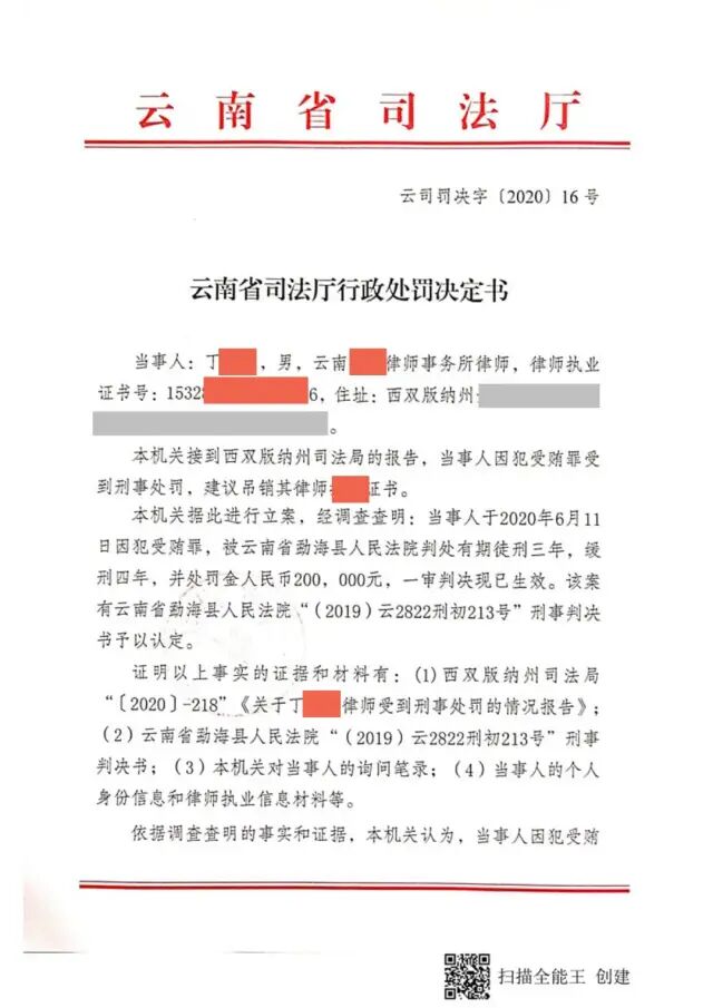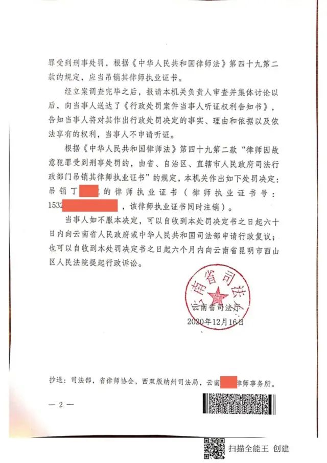 行政处罚:云南省司法厅于2020年12月16日给予丁某吊销律师执业证书的行政处罚。