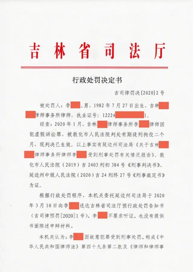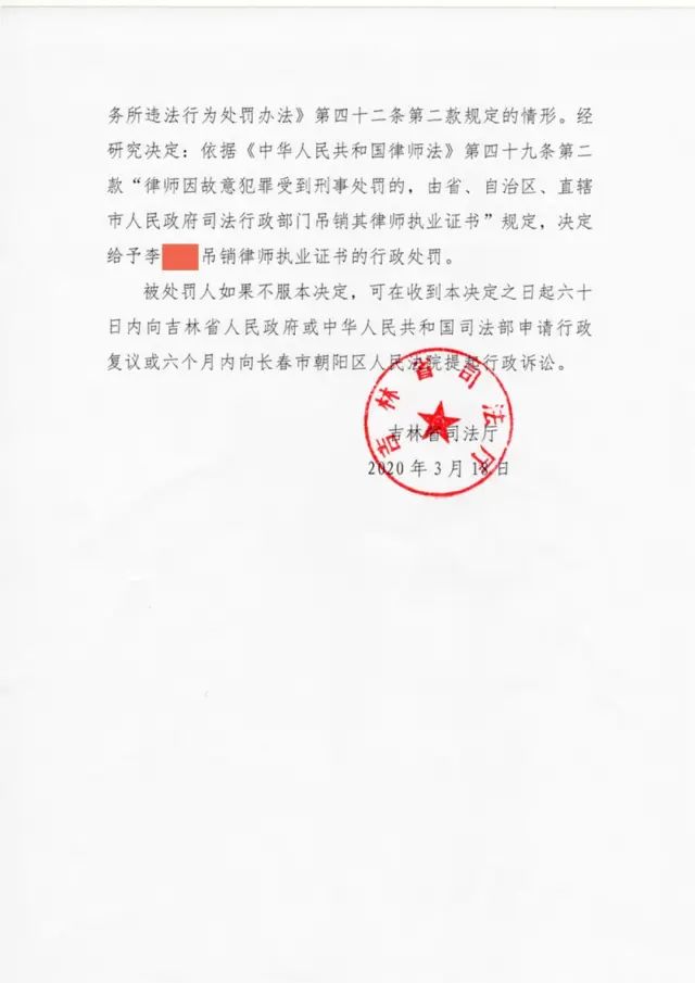 行政处罚:吉林省司法厅于2020年3月18日给予李某吊销律师执业证书的行政处罚。