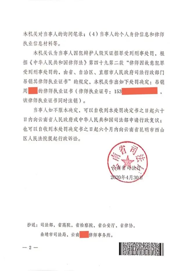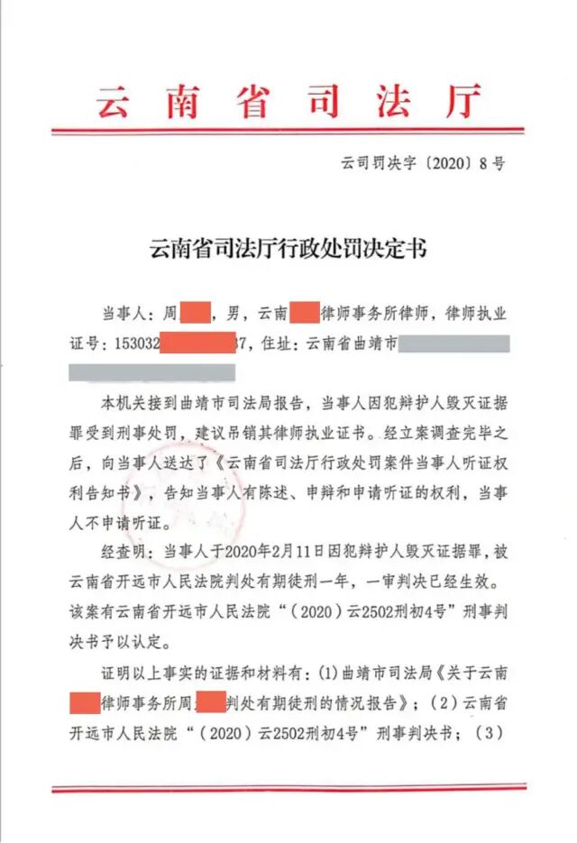 行政处罚:云南省司法厅于2020年4月30日对周某作出吊销律师执业证书的行政处罚。
