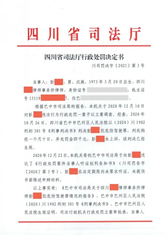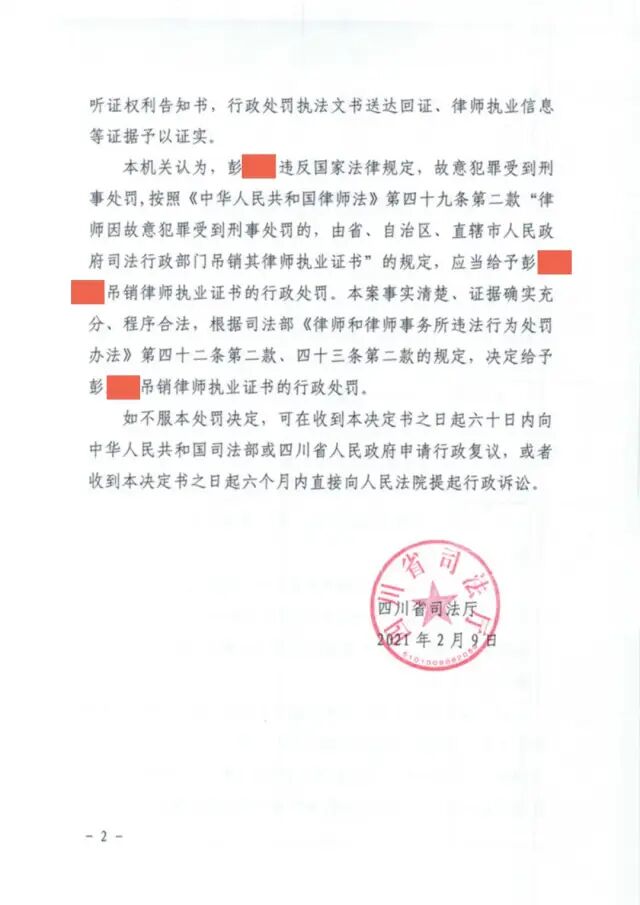 行政处罚:四川省司法厅于2021年2月9日给予彭某吊销律师执业证书的行政处罚。