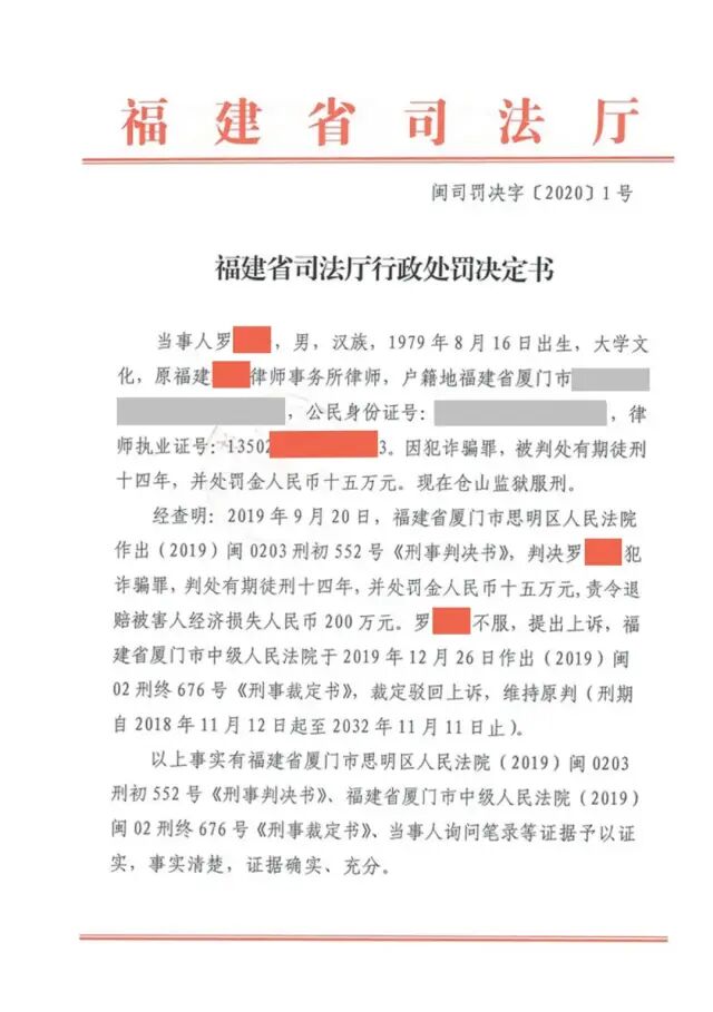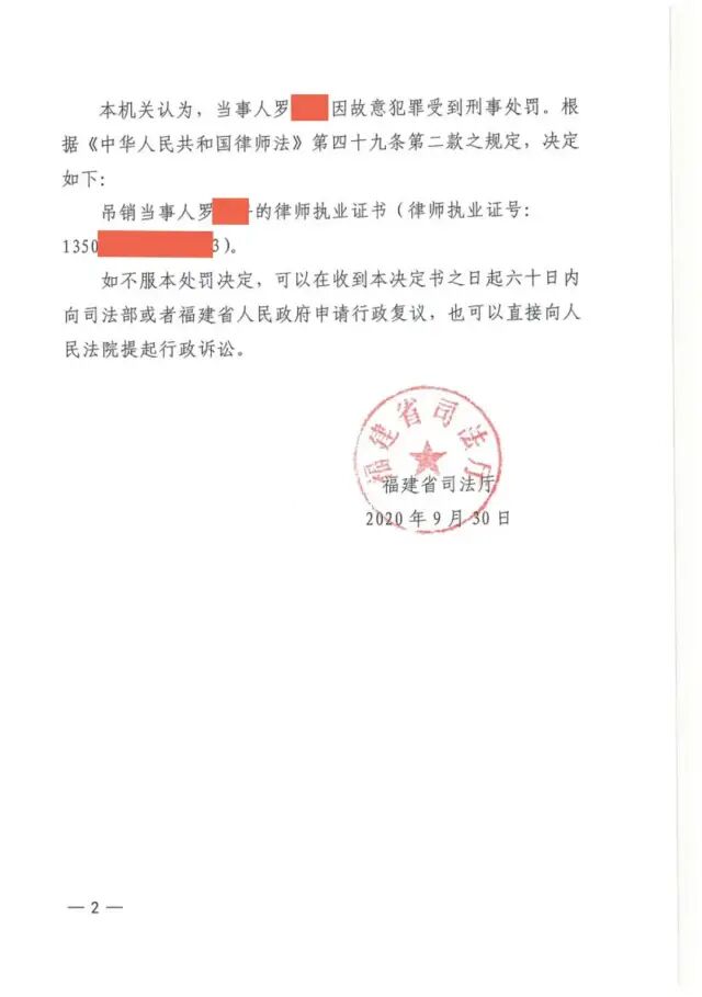 行政处罚:福建省司法厅于2020年9月30日对罗某作出吊销律师执业证行政处罚。