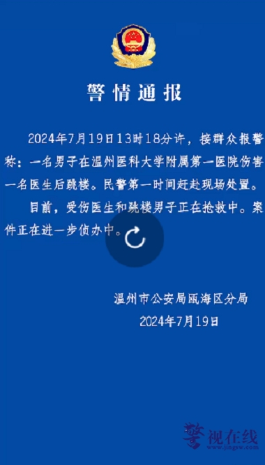 警视在线浙江讯:据温州医科大学附属第一医院信息,2024年7月19日中午13时许,我院心血管内科李晟医生在门诊诊疗中,突然遭到一男子持刀伤害,致多处严重损伤。事发后,我院第一时间组织多方专家联合救治,李晟医生终因伤势过重,经抢救无效,于2024年7月19日21时许不幸去…
