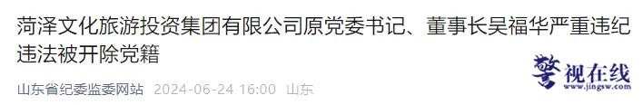 据菏泽市纪委监委消息:日前,经菏泽市委批准,菏泽市纪委监委对菏泽文化旅游投资集团有限公司原党委书记、董事长吴福华严重违纪违法问题进行了立案审查调查。经查,吴福华丧失理想信念,背弃初心使命,与他人串供,对抗组织审查;无视中央八项规定精神,违规接受旅游活动…