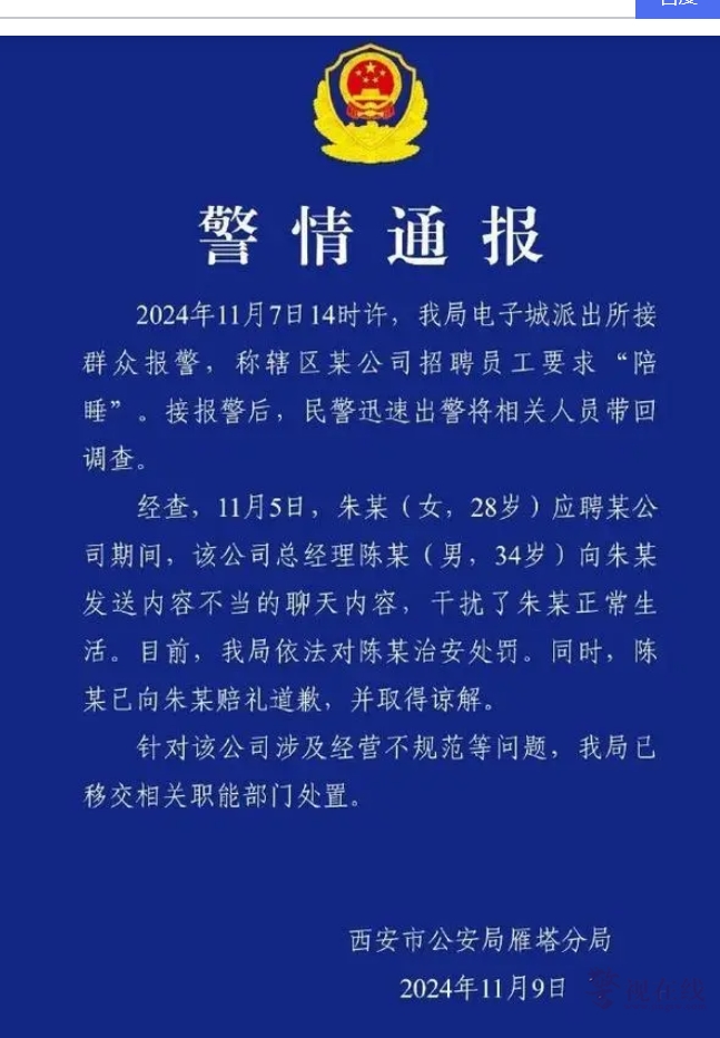 近日,有网友发文称,其应聘了陕西西安一公司的助理岗位,“试岗第一天被要求陪睡、处对象”。11月7日,西安市公安局雁塔分局发布通报称,已第一时间介入调查。11月9日晚,雁塔分局再次发布“警情通报”称,已对该公司总经理陈某(男,34岁)治安处罚。同时,陈某向朱某(…