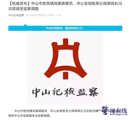 警视在线广东讯:据中山纪检监察7月8日消息,中山市板芙镇党委原委员、市公安局板芙分局原局长冯志胜涉嫌严重违法,目前正接受中山市监察委员会监察调查。记者注意到,2017年冯志胜曾涉醉驾致人受伤案。中山纪检监察2017年3月29日通报称,冯志胜违规组织聚餐活动,并在聚…