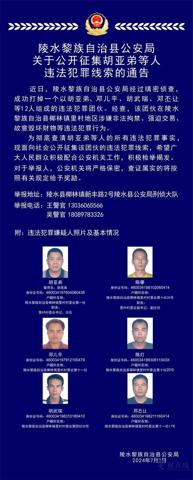 7月2日,海南陵水黎族自治县公安局发布关于公开征集胡亚弟等人违法犯罪线索的通告。编辑:李连杰