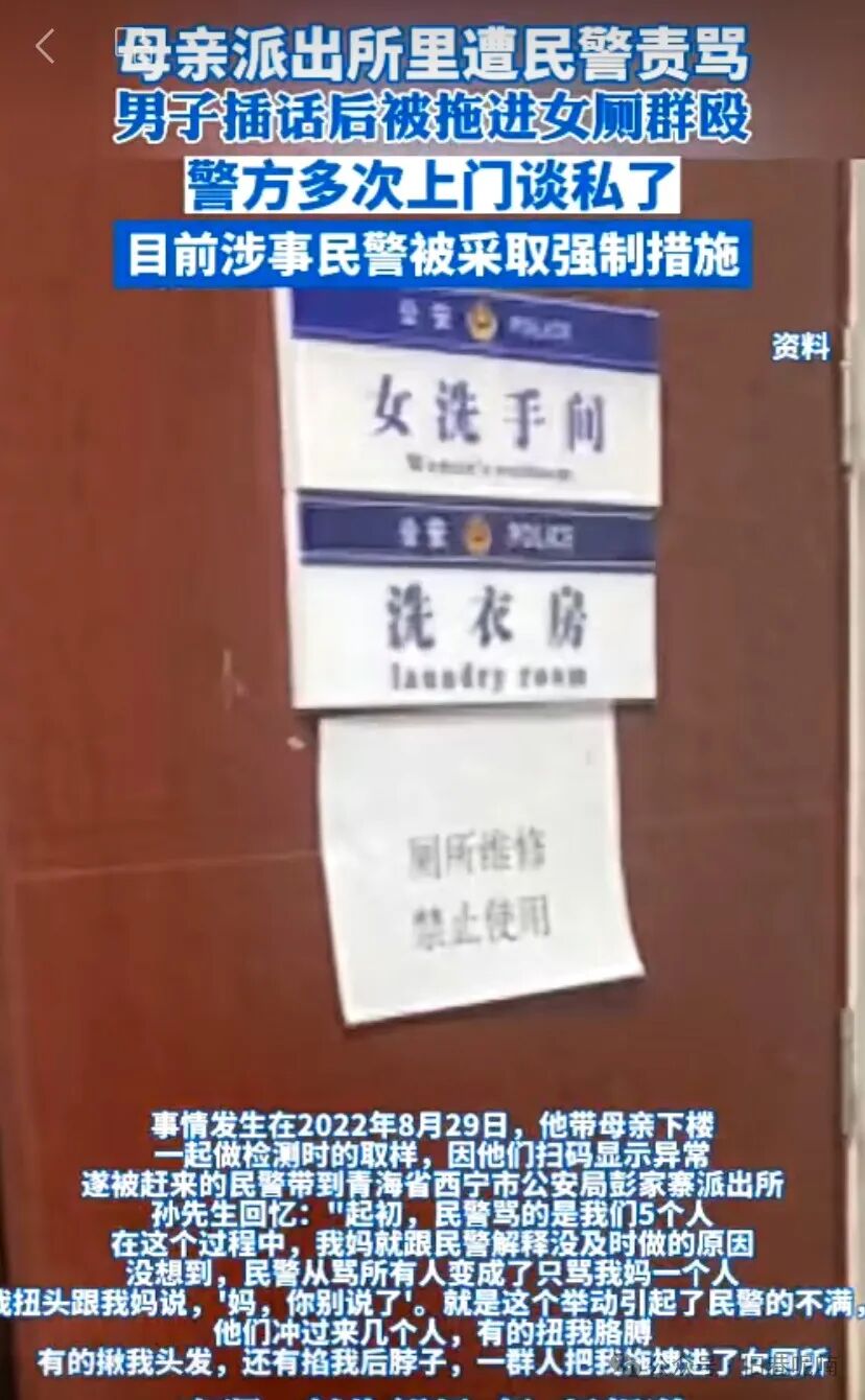 “当时一共是5个人被带到派出所。”孙先生回忆:“起初,民警骂的是我们5个人,在这个过程中,我妈就跟民警解释没及时做的原因,没想到,民警从骂所有人变成了只骂我妈一个人。我扭头跟我妈说,‘妈,你别说了’。就是这个举动,引起了民警的不满,他们冲过来几个人,有的扭我胳膊,有的揪我头发,还有掐我后脖子,一群人把我拖拽进了女厕所,嘴里不停地质问我,‘骂你不服啊,服不服啊?’”