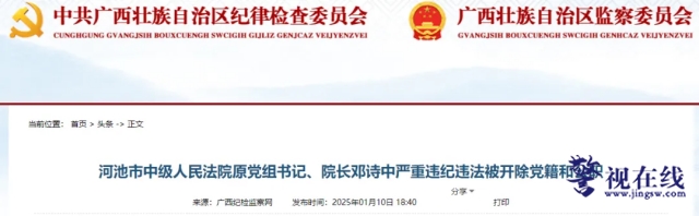 依据《中国共产党纪律处分条例》《中华人民共和国监察法》《中华人民共和国公职人员政务处分法》等有关规定,经自治区纪委常委会会议研究并报自治区党委批准,决定给予邓诗中开除党籍处分;由自治区监委给予其开除公职处分;终止其中共河池市第五次代表大会代表资格;将其涉嫌犯罪问题移送检察机关依法审查起诉,所涉财物一并移送。延伸阅读:中级法院党组书记、院长涉嫌严重违纪违法任上被查。