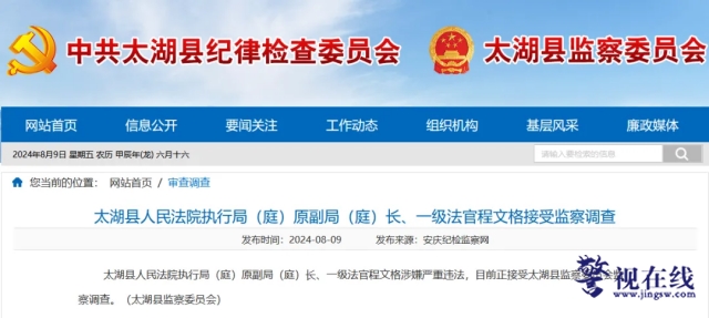太湖县人民法院执行局(庭)原副局(庭)长、一级法官程文格涉嫌严重违法,目前正接受太湖县监察委员会监察调查。(太湖县监察委员会)