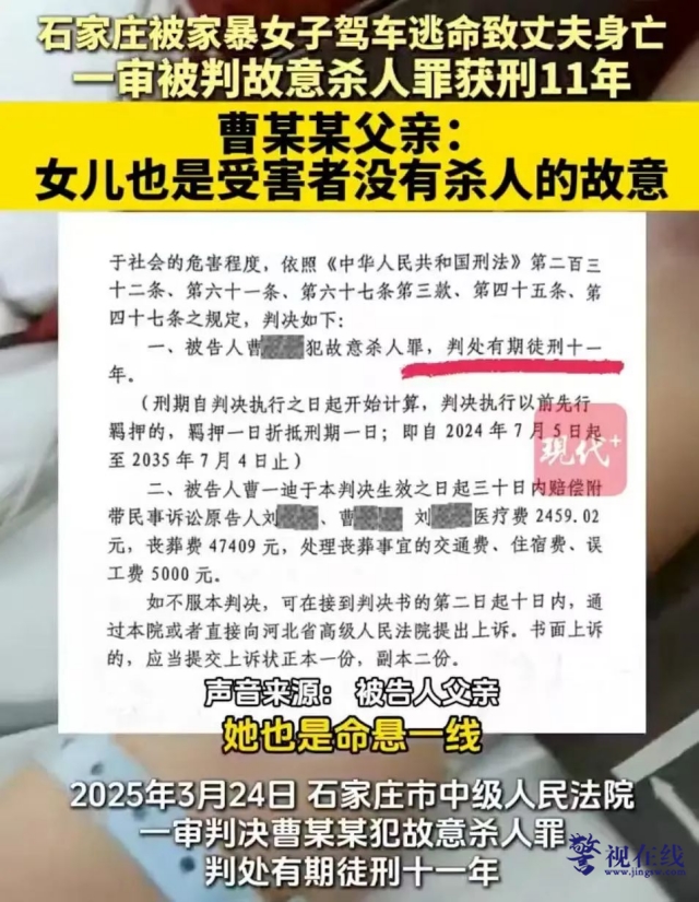 明知丈夫趴在前机盖,仍高速行驶并甩方向盘,虽案前遭遇严重殴打,但驾车离开时没殴打,曹女士的家人认为女儿非常冤枉,认为其系正当防卫或紧急避险。对此,2025年3月24日,石家庄中院一审《刑事判决书》显示,