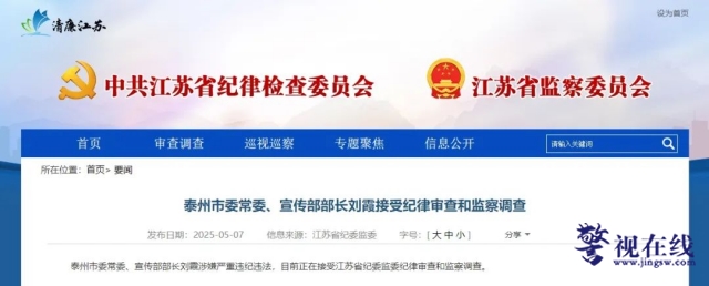 据清廉江苏5月7日消息,泰州市委常委、宣传部部长刘霞涉嫌严重违纪违法,目前正在接受江苏省纪委监委纪律审查和监察调查。