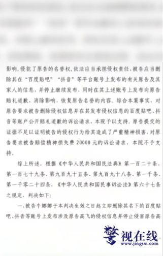 据牛女士在视频中发布的法院判决称,牛女士须在贴吧、抖音账号上发布向原告的赔礼道歉声明,“并至少保持15日不删除、不下架”。