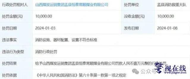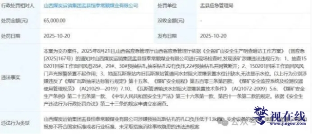2025年10月20日,该公司因瓦斯钻孔不达标、安全设备不合规且未消除隐患被立案调查,被盂县应急管理局处罚6.5万元;2024年1月3日,因消防设施、器材配置设置不符合标准,被盂县消防救援大队罚款1万元。