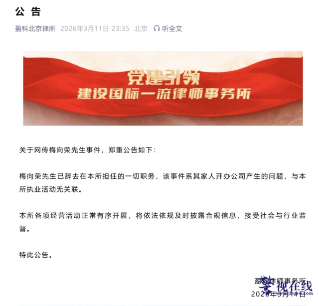 3月11日晚间,知名律所盈科律师事务所发布公告,对网传该所创始人梅向荣涉融资担保方面的情况作出说明。