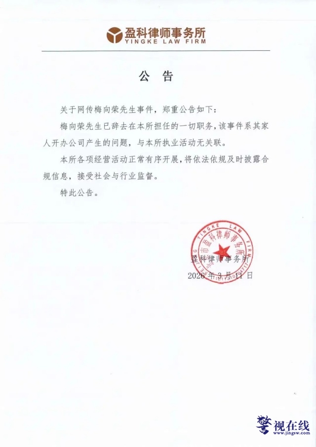 盈科律师事务所发布公告称,梅向荣已辞去在盈科律师事务所担任的一切职务,该事件系其家人开办公司产生的问题,与本所执业活动无关联。