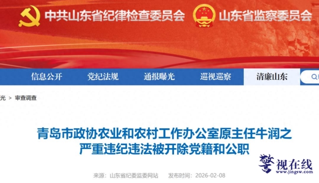 8日,山东省纪委监委网站通报——青岛市政协农业和农村工作办公室原主任牛润之严重违纪违法被开除党籍和公职据青岛市纪委监委消息:日前,经青岛市委批准,青岛市纪委监委对青岛市政协农业和农村工作办公室原主任牛润之严重违纪违法问题进行了立案审查调查。经查,牛润之…