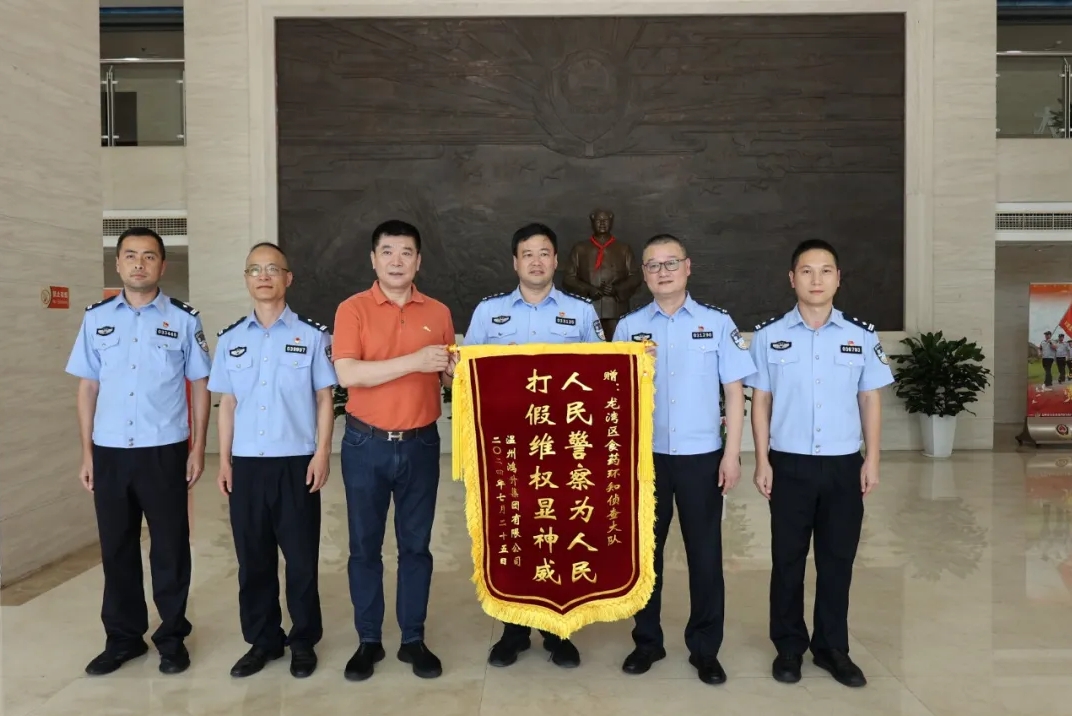日前,温州鸿升集团有限公司(下称鸿升集团)董事长管鸿升一行3人来到浙江省温州市公安局龙湾分局,为该局送上一面写着“人民警察为人民打假维权显神威”的锦旗和一封感谢信,对该局打掉一个生产假冒注册商标的犯罪团伙,挽回企业经济损失表示感谢。副区长、分局局长叶辉,分局党委委员、副局长胡跃新,分局食药环知侦查大队相关负责人接收了锦旗。