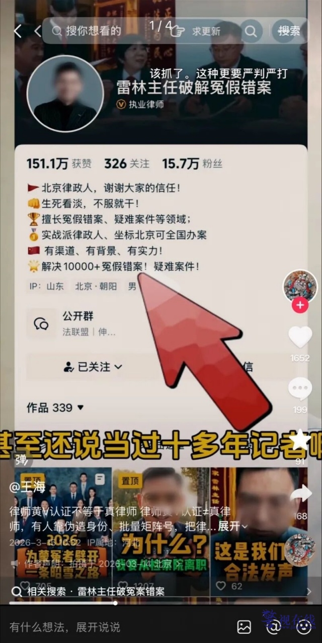 据“亮平团队破解冤错案”账号简介显示,该账号自称是“坐标北京的律师团队,全国办案”。视频中,“雷林主任”自称为二十年资深律政人,专注冤假错案,成功率高达90%以上,自2025年11月28日发布首条视频以来,已发布335条视频,拥有16.1万粉丝,154万获赞。