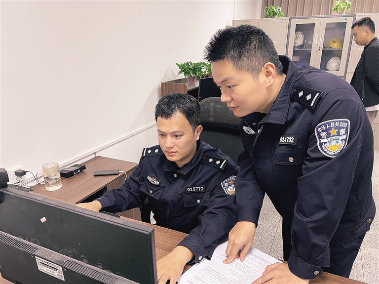 海口市海府路派出所民警肖伟(左)和同事讨论案件。记者黄君摄